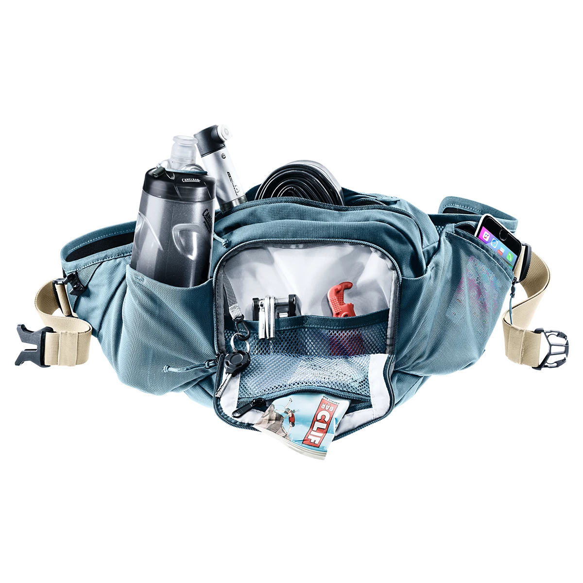 Lightweight and ergonomic space miracle: The PULSE PRO 5 hip bag from deuter offers more storage space than you’d think from the outside thanks to its versatile organisational units. There’s room for your water bottle in the bottle holder, your mobile phone in the zipped pocket on the strap, your tools in the inner mesh pocket, your snacks in the main compartment and your knee protectors on the outside of the bag. Even when filled to the brim, the Hip Bag sits comfortably on your hip thanks to its breathable material and a compressible strap. So you can fully focus on the trail.