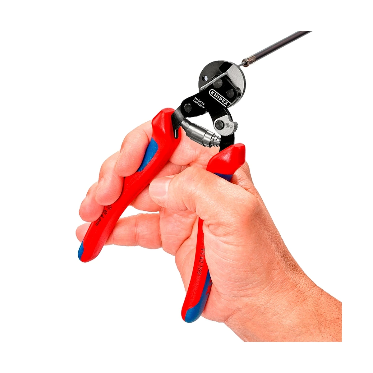 The compact, lightweight, high-strength wire rope cutter by Knipex even easily cuts through high-strength wire ropes of up to 4 mm. When used in your bicycle workshop, the high-end cable cutter promises precisely cut inner and outer gear and brake cables. Precision cut edges ensure low-friction cable movement for improved shifting and braking performance.