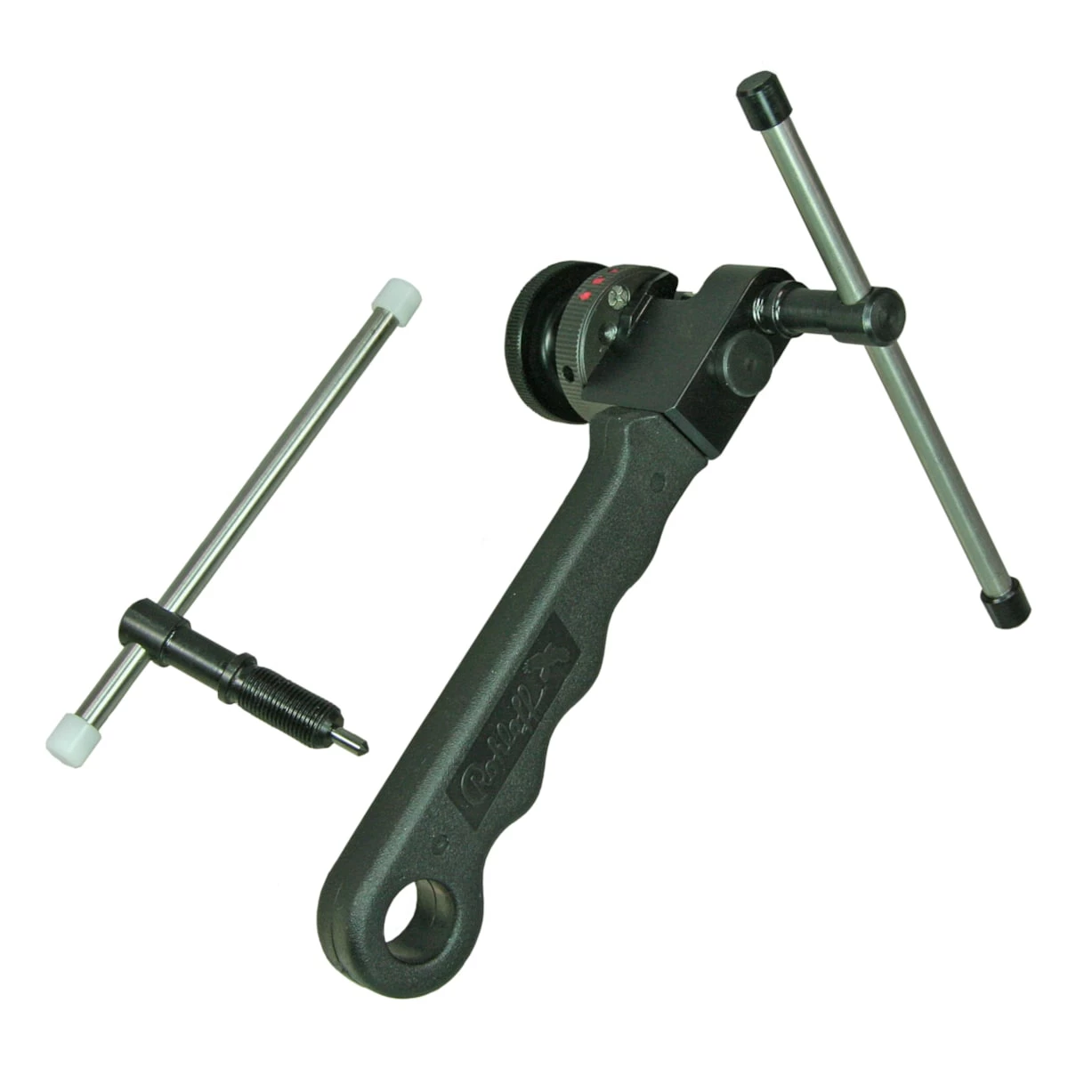 The universal chain tool Rohloff Revolver III fulfills the function of all previous chain breaking tools, including those for 10- and 11-speed chains. It comes with two spindles: a black one for all standard chains including Shimano 11-speed chains, and a white spindle especially for Campagnolo 11-speed chains. The universal tool Rohloff Revolver III allows a perfect opening and closing of all currently available derailleur chains and single-speed chains. The chain is fixed tightly in the tool in every working step, which makes accurate working possible.
