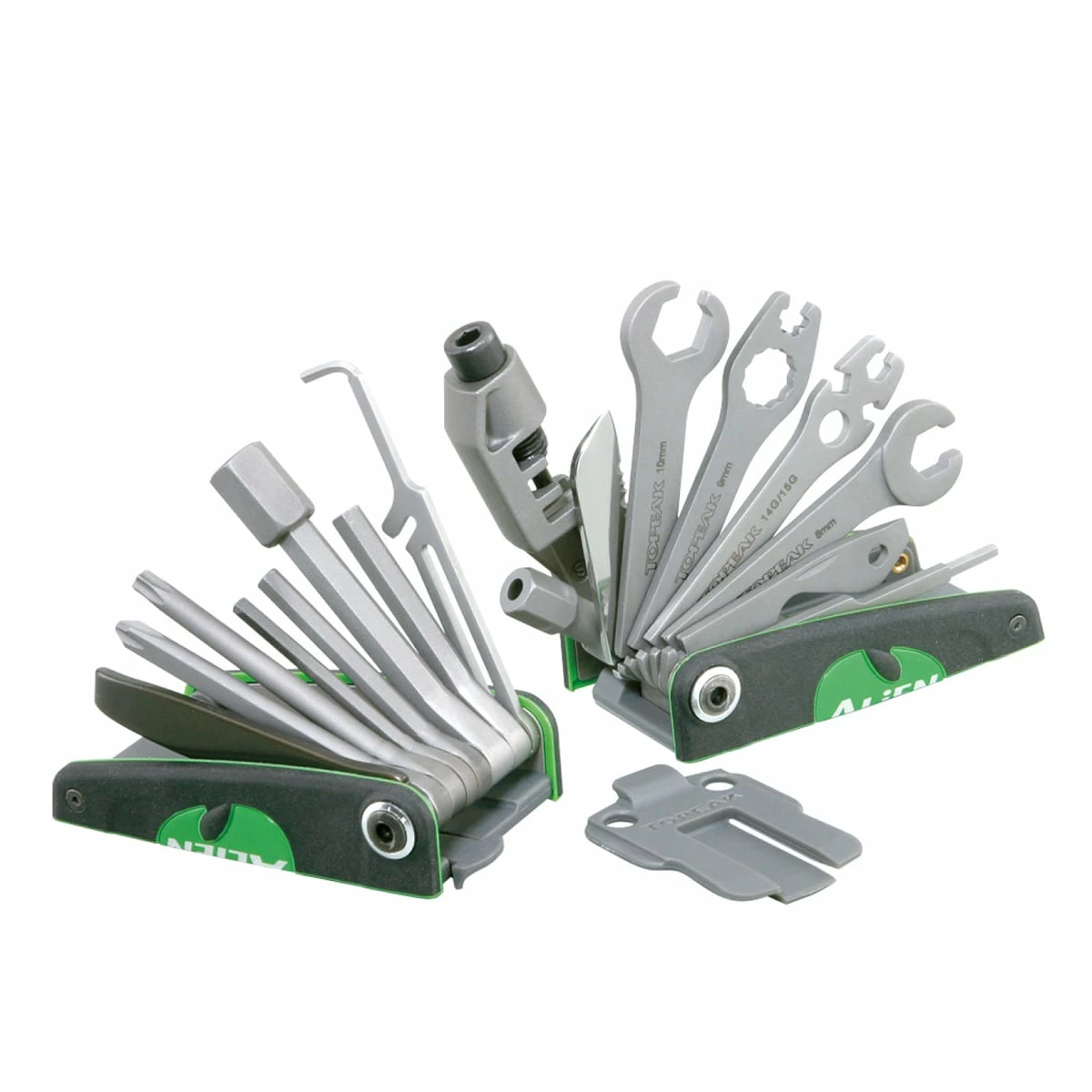 Featuring no less than 31 tools, the Topeak Alien 3 is a true all-rounder. The clever, two-piece design makes this wide range of features possible in the first place. You may even separate the tool to two units. The stylish Alien logo will help you join the two pieces together again. Apart from the most important hex wrenches, spanners, box-end wrenches, screwdrivers and spoke wrenches, the Alien 3 offers everything you need for roadside rescue: a chain tool, a chain breaker, a tyre lever and a chain hook. Additional useful tools complete the range. The pocket-size home workshop comes in a practical nylon bag. A top tool for all those who want to be well prepared for any situation.