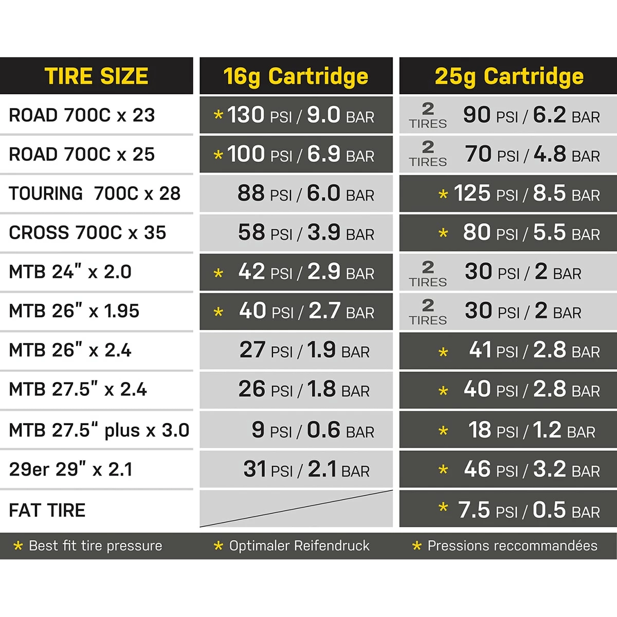 Pressure refuelling for your tyres With Topeak’s CO2 cartridges, tyre inflation becomes so easy: Simply screw the cartridge on a suitable CO2 pump and, within seconds, your tyres are back in shape – ideal for mounting tubeless tyres as well. Topeak’s 25 g CO2 cartridges offer the ideal filling quantity for hybrid tyres or mountain bikes with 27.5“ and 29“ wheels. This set of 2 gives you a cartridge for both tyres and makes sure you will have enough air for your tours.
