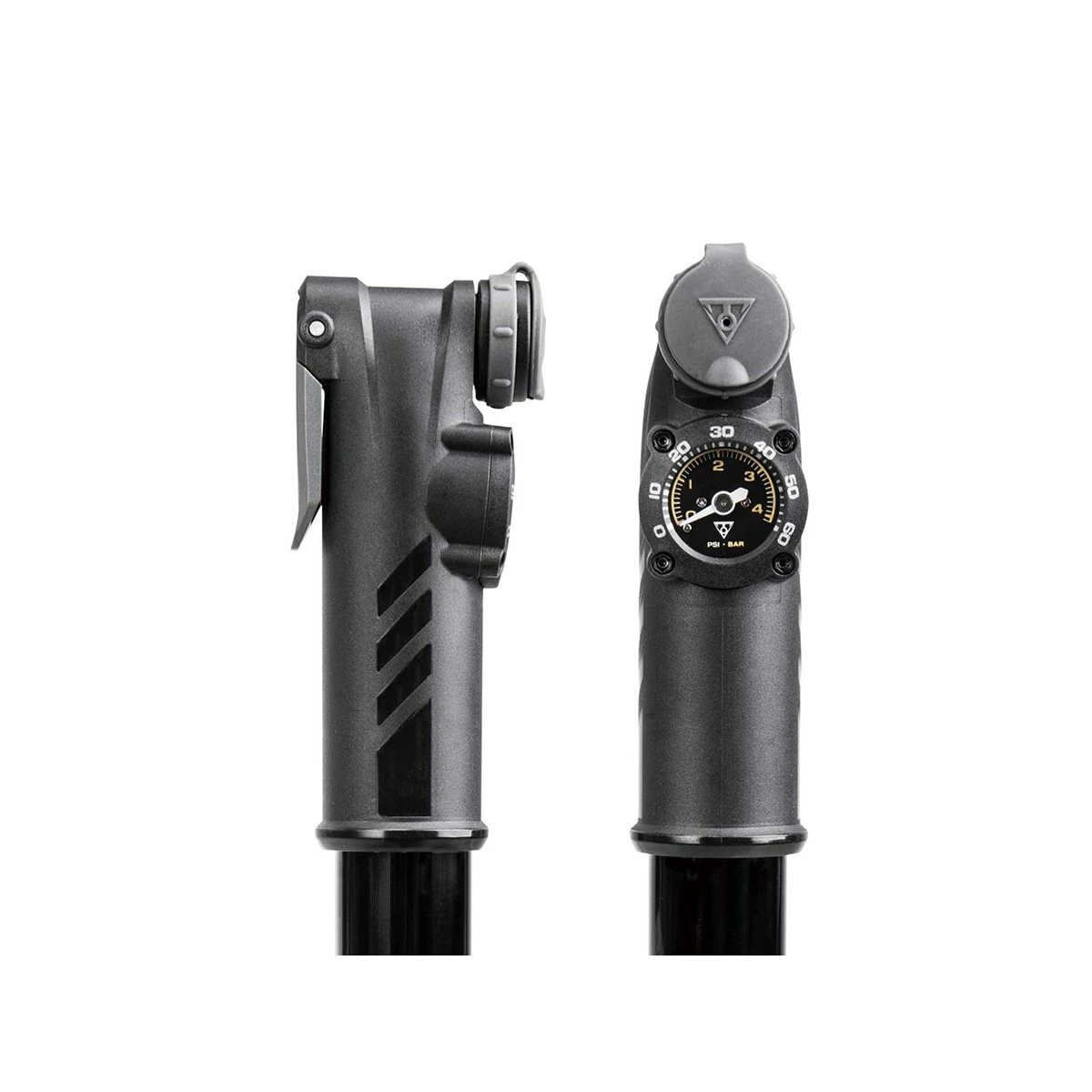 The lightweight and compact Topeak Mountain DA G Dual-Action pump allows you to quickly inflate large-volume MTB tyres. The Dual-Action Technology doubles volume with each stroke and inflates tires up to pressure fast without making your arms hurt. An easy-to-read gauge displays the tyre pressure. The Mountain DA G mini pump is compatible with Presta/Schrader/Dunlop valves. Thanks to its compact size and a low weight, the pump perfectly fits into your jersey pocket or backpack.